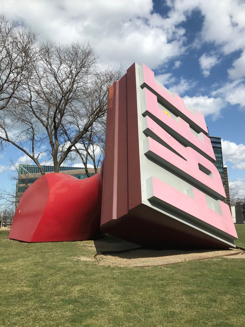 I was looking at some art, a set of large tubes, which are sliced in a way to look like the quills of pens so that they come to a point, almost. Or a straw that is cut at an angle so that you can scoop the Icee instead of drink it. Each tube was about 10ft long and bright red. They were arranged with a few standing and a couple lying onto the others extending even higher into the air.